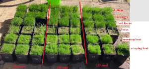 Les six espèces différentes ont été cultivées dans des pots de 0,0196 m². Ces pots étaient arrosés trois fois par jour avec un total de 10 ml par pot afin de garder les graines et le sol humides pour faciliter la germination. Dès lors qu’elles ont germé, l’apport en eau quotidien a été doublé (20 ml). Puis une fois la germination complétée, un seul apport quotidien de 60 ml d’eau a été effectué. Toutes les deux semaines (après germination), 1,8 g d’azote a été ajouté aux pots avec l’engrais Kamasol Brilliant Grün 10-4-7.