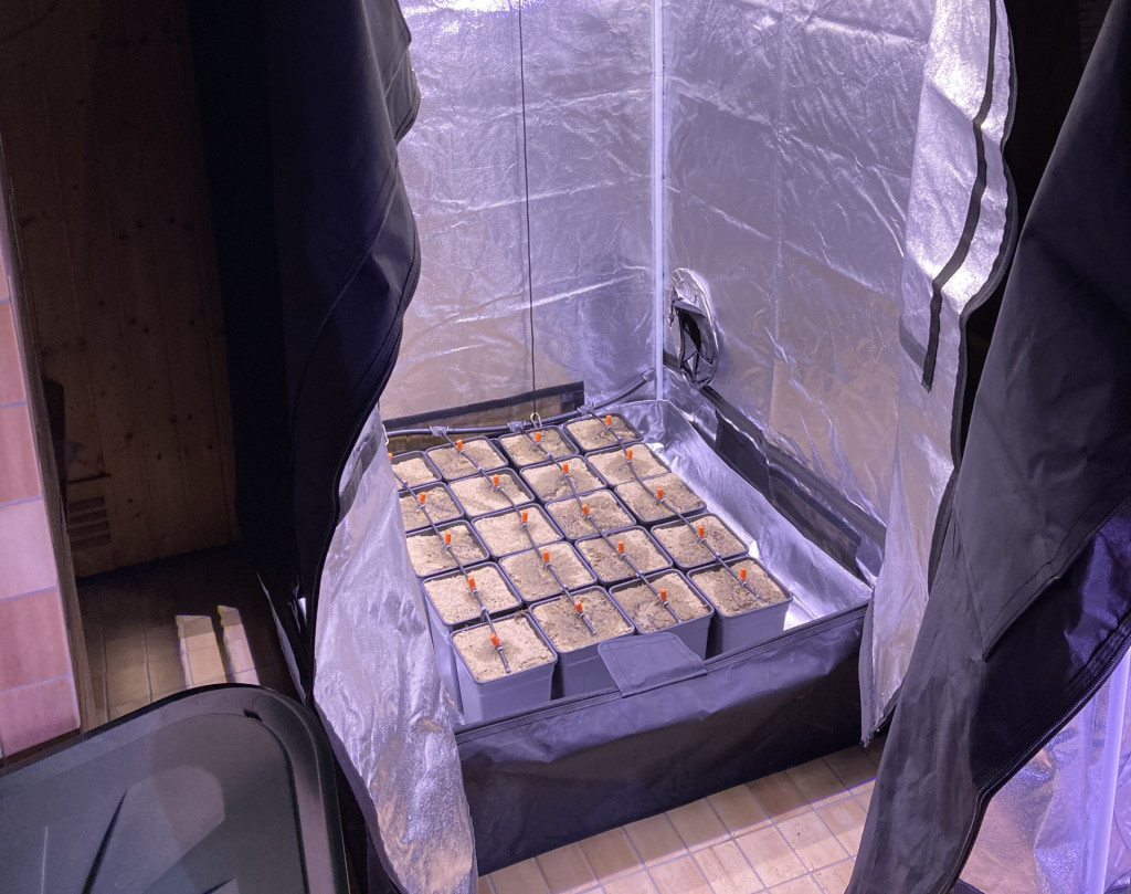 Trois tentes avec trois intensités de lumière différentes (125,250, 500 µmol produits 16 h par jour) ont été installées pour l’expérience. Chacun des cultivars étaient plantés dans trois pots dans chaque tente, il y avait donc au total 18 pots par tente.