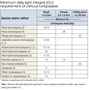 Par exemple le Ray-grass anglais, dans les fairways, a besoin d’un DLI minimal de 10 mol/m²/jour. Delon Daniel Hahn, la littérature manque d’informations sur les exigences en DLI des principales espèces de gazon de saison froide comme les fétuques, les agrostides, le paturin des prés et d’autres. Il a donc décidé de mener une étude préliminaire pour estimer la quantité de lumière qu’exigent six espèces de gazon pour produire une qualité acceptable :