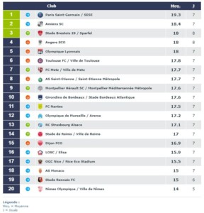 En fin de classement, l’OGC Nice(15.5) remonte et quitte les trois dernières places. C’est le Stade Rennais(15) qui chute et se retrouve en 19ème position derrière l’AS Monaco(15) et devant leNîmes Olympique(14).