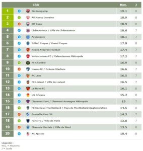Depuis notre dernière mise à jour, l’En Avant de Guingamp(19,1) reprend sa place de leader aux mains dela Berrichonne de Châteauroux(18.6) qui chute à la 4ème place. L’AS Nancy Lorraine(18.9)et leStade Malherbe Caen(18.9)se retrouvent respectivement en deuxième et troisième position.