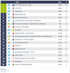 En fin de classement, nous retrouvons leNîmes Olympique(15.4), l’AS Monaco(14.6) et l’OGC Nice(14.3) qui améliorent leurs notes après chaque journée.
