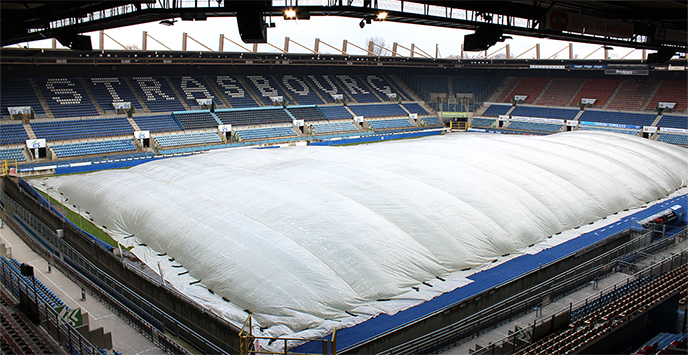 C’est le pendant « gaz » du circuit chauffant électrique : le chauffage est ici assuré par un circuit hydraulique alimenté en eau chaude (ou un fluide caloporteur) produite grâce à une chaufferie. On trouve un tel système au stade Saint-Symphorien de Metz. «Nous bâchons aussi la pelouse pour garantir une bonne tenue du terrain le jour de match, ajoute Jean-François Girard, le référent pelouse du stade Saint-Symphorien. La bâche permet également d’augmenter l’efficacité du chauffage, car elle conserve les calories apportées par le chauffage en surface, et de protéger les brins de gazon en surface, fortement fragilisés par les températures négatives qui peuvent atteindre jusqu’à -15°C la nuit au sol.»