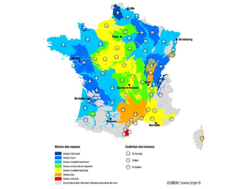 Le Bureau de Recherches Géologiques et Minières (BRGM) a dressé le bilan de la situation des nappes phréatiques en France dans un communiqué de presse. La situation reste globalement satisfaisante mais a une légère tendance à se dégrader.