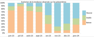 En janvier 2024, les niveaux de 51 % des points d’observation étaient en hausse. La recharge ralentit puisqu’en décembre 2023 ce chiffre atteignait les 69 %.