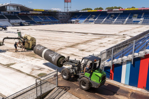 Initialement, le gazon synthétique a été remplacé par un gazon naturel importé d’Allemagne. Mais ce dernier a eu du mal à s’implanter avant le début de la saison 2020-2021, notamment en raison de la décision tardive de repasser à une pelouse naturelle. « Nous avions une couche supérieure de 16 cm très bien préparée qui contenait une grande partie de sol de tourbe forestière acide pour stimuler l’absorption des nutriments. Comme la décision a été prise tardivement, l’ensemencement n’était pas envisageable. De ce fait, le gazon composé à 70 % de pâturin des prés, 25 % de Ray-grass et 5 % de fétuque rouge a rapidement été évalué », complète-t-il.