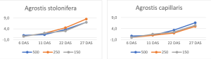 Les résultats ne sont pas concluant non plus pour les deux espèces d’agrostis. La qualité du gazon d’agrostis capillaris était meilleure avec une intensité lumineuse de 500. Enfin le Poa pratensis (pâturin des prés) a présenté une mauvaise germination, qu’importe l’intensité lumineuse. « En examinant la littérature, il semble clair que Poa pratensis nécessite beaucoup de lumière pour la germination et la croissance. Poa pratensis est couramment utilisé comme une espèce de gazon pour le football, il est toutefois douteux qu’une telle espèce soit adapté aux environnements de stade car potentiellement beaucoup de lumière doit être complétée. Basé sur les résultats, Lolium semble être une espèce plus appropriée », explique l’agronome.