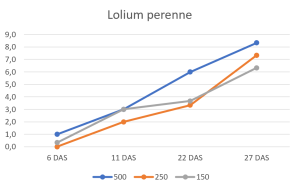 Parmi les 6 graminées de l’expérience, le Lolium pérenne a été la plus rapide à se développer. Il est également le cultivar qui a produit le plus de biomasse à la fin de l’expérience. « Il semble que Lolium est une espèce candidate très intéressante pour les situations de gazon sous faible qualité de lumière en raison de leur capacité de germination rapide et de leur capacité à produire de la biomasse/fermer la canopée rapidement », indique Daniel Hahn.