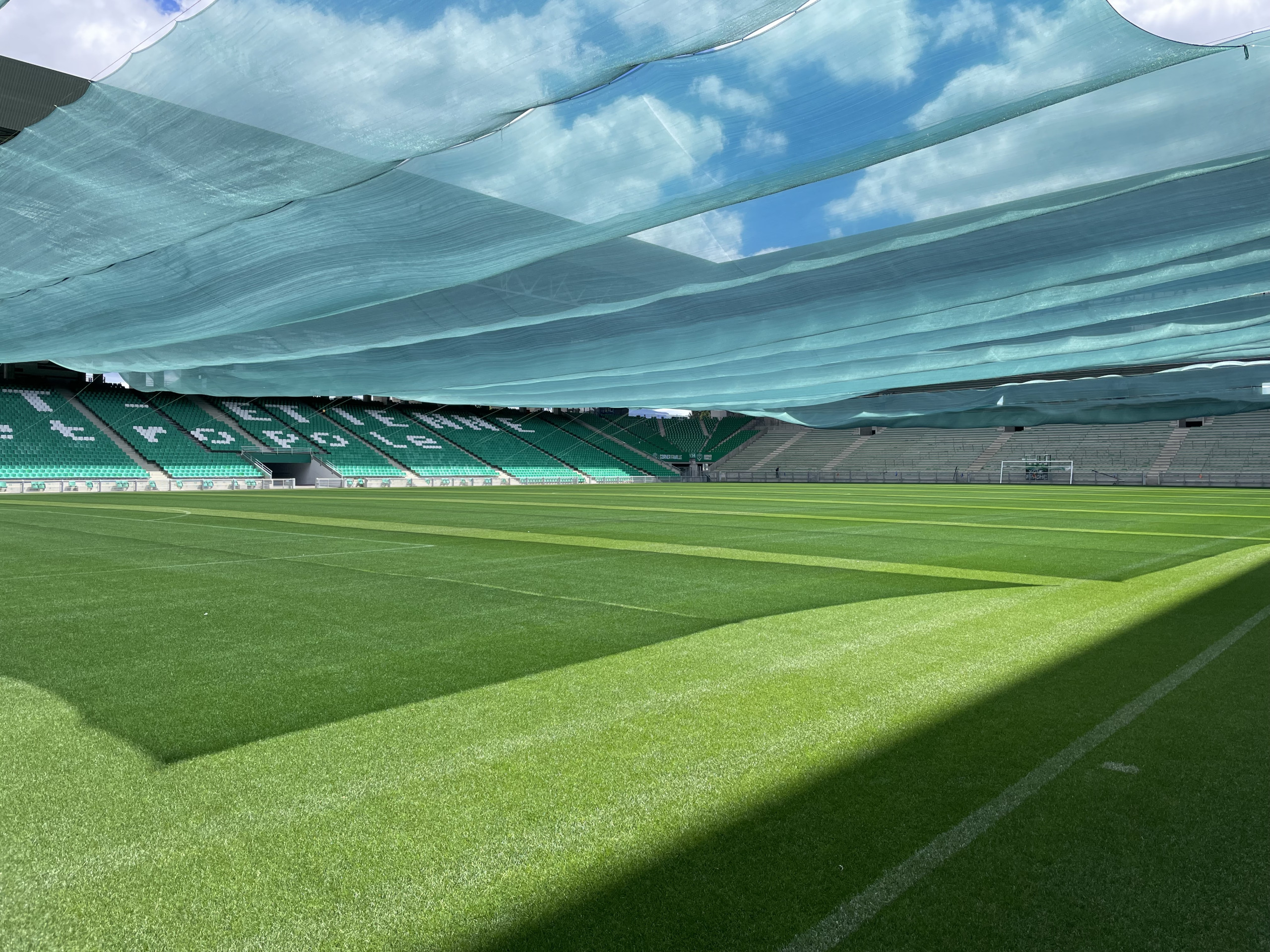 Geoffroy-Guichard innove : des voiles pour protéger la pelouse en été