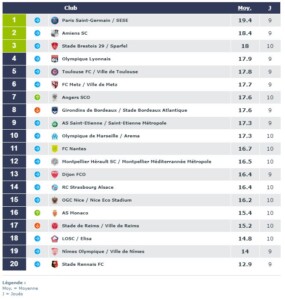 En fin de classement, leStade Rennais(12.9) se retrouve en dernière position tout juste derrière leNîmes Olympique(14). L’AS Monaco(15,4)remonte et quitte les trois dernières places du classement. C’est le LOSC(14.8) qui chute et qui se retrouve en 18ème position.