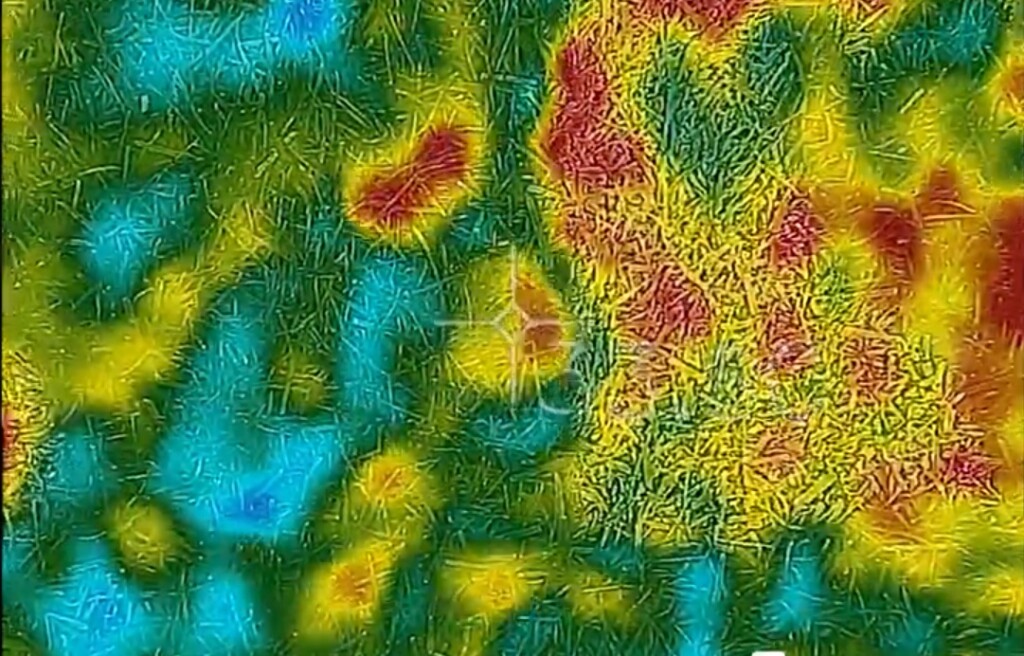 Au niveau de la surface foliaire, les températures varient entre 31 et 45°C suivant la localisation en plein soleil avant le syringe. Les mesures sont effectuées avec une caméra thermique. La température est estimée via le rayonnement infrarouge que le gazon émet et représente la seule mesure fiable en ce qui concerne le gazon lorsqu’il est en plein soleil.
