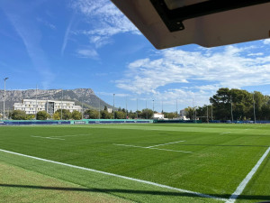 Ce dernier est équipé d’une pelouse synthétique couverte et d’une nouvelle pelouse hybride. Les deux surfaces de jeu sont entretenues par la société SME (Sport Méditerranée Entretien). Le terrain synthétique a été conçu pour travailler les mêlées, les lancements de jeu et les « skills ». « Il y avait un besoin d’infrastructures pour pouvoir performer au niveau professionnel. Le bâtiment a été construit avec l’aide de Patrice Collazzo, qui était alors directeur technique du club. Il avait eu une expérience à La Rochelle qui a également un terrain synthétique couvert », confie Mathieu Pimenta, le stadium manager du campus. Il n’est toutefois pas aux normes en termes de dimensions (70 m par 35 m). En revanche, il s’agit de la technologie hybride homologuée par World Rugby.