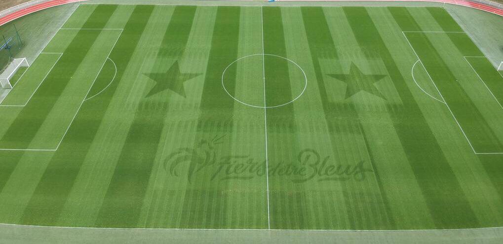 Rebelote en début de semaine, pour fêter la « rentrée » de l’Équipe de France de Football. Les Champions du monde, qui se déplacent ce soir à Munich pour affronter l’Allemagne en match amical, ont eu droit à une petite surprise lors de leur rassemblement de préparation à l’INF Clairefontaine : le terrain Pierre-Pibarot avait été imprimé de la mention « Fiers d’être Bleus ».