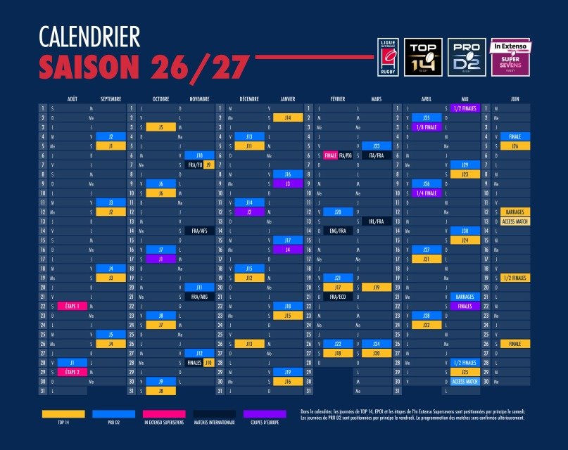 La Ligue Nationale de Rugby (LNR) a publié les dates des championnats professionnels pour la saison 2026/2027.
