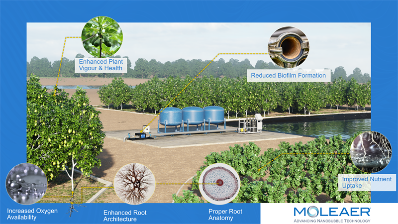Moleaer Inc est le leader de la technologie des nanobulles avec 1 500 générateurs de nanobulles installés dans plus de 30 pays. Ce système, centré sur l’eau, permet d’améliorer les performances de nombreux processus industriels : augmentation de la production agricole, optimisation de l’utilisation de l’eau et restauration des mileiux aquatiques sans usage de produits chimiques.