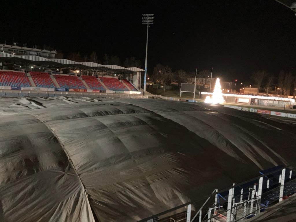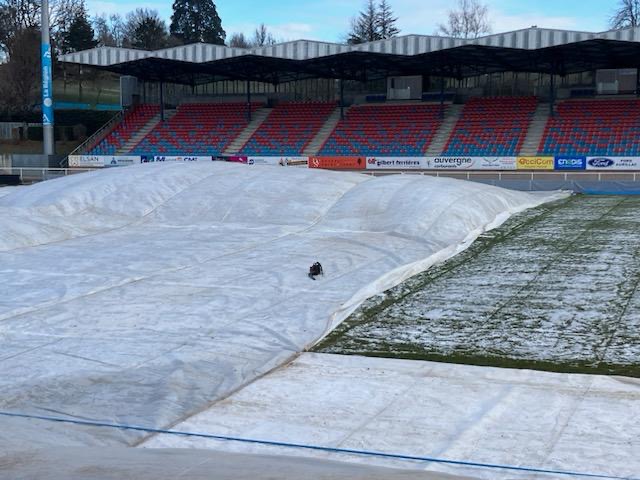 A Aurillac, les températures sont restées sous les -10°C pendant plus de dix jours, allant jusqu’à -12°C. Dès le mardi 30 décembre, la décision a été prise de bâcher la pelouse. A partir du 5 janvier, pour faire baisser le gel, trois chaudières aérothermes ont été installées sous la bâche. Deux autres ont été ajoutées compte tenu des températures extrêmes. Il y avait au total 5 aérothermes jour et nuit jusqu’au jeudi précédent le match.