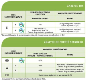 La qualité DLF Select ’00’ garantit une pureté maximale basée sur une analyse ISTA standard.Dans un échantillon standard de semences de qualité « 00 », on trouve 0,0% des autres semences.Pour encore plus de sécurité, une recherche d’échantillon « 10x » est effectuée pour la note «S».Le standard supérieur «S1» garantit le résultat de 0,0% d’autres semences, tandis que «S2» indique l’absence de graminées grossières, avec uniquement des traces d’espèces dicotylédones non nuisibles à la qualité du gazon.Outre les grades de pureté Select mentionnés, DLF propose également des grades professionnels «A1» et «A2» pour le marché des équipements, offrant unniveau de pureté significativement supérieur par rapport au standardeuropéen « semencecertifiéeEU » – exempt de graminées nuisibles et niveau significativement réduit de pâturins.