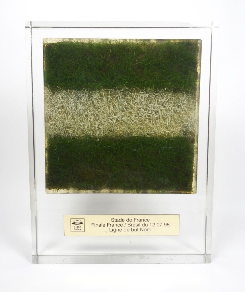 « Et 1, et 2 et 3-0 ! », c’est ce qu’a dû chanter le gagnant de cette enchère, qui a pu ainsi s’offrir le « Lot 732 – Coupe du Monde 1998 : Pièce historique vendue une première fois lors d’une vente » comme l’annonçait le site officiel de la vente aux enchères. Il s’agit d’une pièce historique vendue une première fois lors d’une vente caritative : une portion de terrain (65 x 50 cm) de 40 kilos contenant la ligne de but nord du Stade de France et la pelouse l’entourant. Sur la plaque commémorative est inscrit : « Finale France-Brésil du 12 juillet 1998, ligne de but nord ». Estimée au départ entre 7 000 et 10 000 euros, la pièce a finalement été adjugée à 6 800 €.