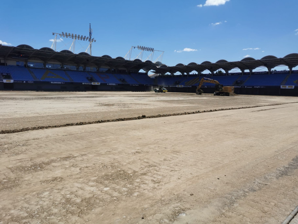 Les travaux ont débuté le 17 juin à Aimé Giral. Une vingtaine d’engins a dans un premier temps évacué l’ancienne pelouse. Il sera ensuite temps de travailler le nouveau substrat. Les travaux sont gérés en co-traitance par le groupement Parcs&Sports – Spie Batignolles – Natural Grass tandis que la maitrise d’œuvre a été confiée à la société Osmose par la mairie de Perpignan. La pelouse sera semée début août par Yann Pabbruwee, l’actuel Head groundsman d’Aimé-Giral pour Parcs & Sports. Le choix des graminées est encore en discussion. La pelouse hybride Grassmax sera stitchée début septembre. Déjà présente dans bon nombre de stades, cette technologie est particulièrement appréciée pour le rugby. Elle offre une surface de jeu solide capable de résister aux nombreux appuis intenses, dont les mêlées notamment.