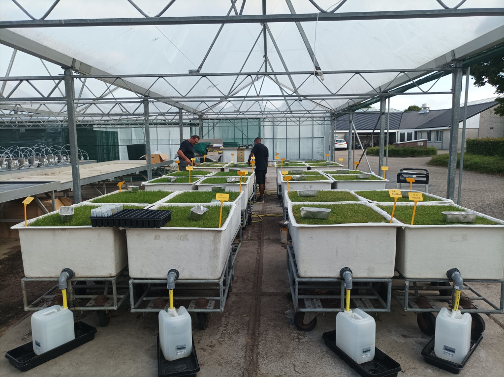 Afin d’étudier cela, une configuration de recherche a été créée. « Des recherches antérieures ont été effectuées in situ, mais avec un drainage mixte, des textures différentes et une grande hétérogénéité, aucun résultat concluant n’a été fourni. Par conséquent, nous essayons maintenant d’étudier les mécanismes avant d’extrapoler à l’échelle du champ. À cette fin, nous faisons une étude dans des caisses. Les caisses ont une dimension de 90x70x45 et il y a un drain situé au fond (voir photo des caisses sur notre poteau). Il y a 3 types d’herbe (naturel, construction hybride 1 et construction hybride 2), 2 textures de sol et 2 types d’engrais (organique et minéral), tous en double, soit 24 caisses au total. Après l’établissement, les différents engrais sont ajoutés et l’eau est fournie en utilisant un calendrier d’irrigation afin que le lessivage ait lieu. Chaque semaine (pendant 6-8 semaines), les déchets de tonte sont collectés, séchées, pesées, broyées et envoyées au laboratoire pour analyse C et N. L’eau recueillie dans les drains est mesurée et échantillonnée (NOx et NH4). Ces résultats nous indiquent s’il y a des différences, mais pas encore pourquoi. Par conséquent, un modèle mécaniste (sur Hydrus 2D) est utilisé pour modéliser l’étude et la comparer aux résultats mesurés. Le modèle fournira ensuite un aperçu des mécanismes derrière les différences apparentes. Le bilan de soluté fourni par le modèle peut nous dire ce qui est arrivé à l’azote appliqué, s’il s’est lessivé, s’il est absorbé ou est encore dans l’eau interstitielle. À compter d’aujourd’hui, nous en sommes à la cinquième semaine des expériences et nous prévoyons d’avoir nos résultats et notre rapport d’ici la fin de novembre », détaille le chercheur.