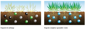 Les engrais se divisent également en deux formulations : les engrais de mélange, où chaque granulé correspond à un nutriment, et les engrais complexes en granulés vrais, qui réunissent tous les nutriments dans un granulé. Le problème avec les engrais de mélange est qu’ils peuvent provoquer une sédimentation des granulés dans l’épandeur. Les granulés lourds (potassium et phosphore) seront les premiers projetés, il n’y aura pas d’homogénéité dans la répartition des éléments nutritifs sur le sol et certaines zones risquent des carences ou des excès nutritifs. Il est donc préférable de favoriser les engrais complexes granulés vrais.