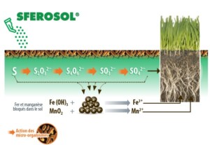 Le soufre réduit les ph trop alcalins les rendant plus favorables à la pousse des graminées limitant les phénomènes de carences en Fer et autres oligoéléments.