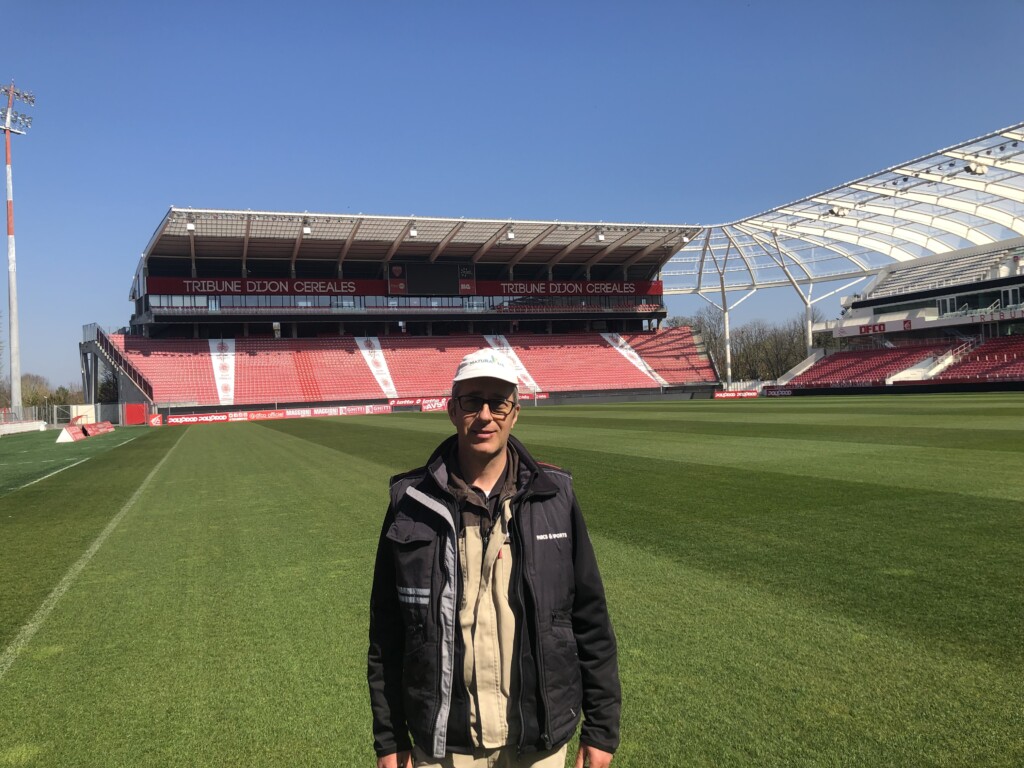 Stéphane Maitre est l’intendant du Stade Gaston-Gérard, l’antre du DFCO – Dijon Football Côte D’Or. Cela fait trois ans qu’il travaille chez Parcs & Sports, soit dès le début du contrat liant la société au club bourguignon, en juin 2016. Il explique qu’un nouveau contrat devrait être signé pour les trois prochaines années.