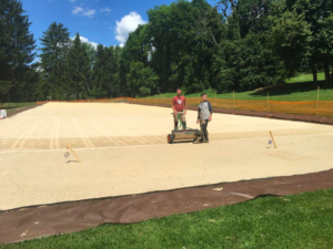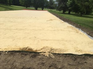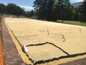 J’ai décidé de tout reprendre il y a 3 ans. Nous avons tout enlevé, tout décontaminé et tout refait en rajoutant du sable et des matériaux. Il y avait une couche drainante en gravier et, par-dessus, nous avons ajouté une vingtaine de centimètre de sable de construction de green, amendé avec de la matière organique pour que ça ne soit pas que du sable pur. Un système d’arrosage périphérique a ensuite été installé pour arroser la gazonnière au même titre que les greens, les fairways et les départs. Puis nous avons semé.