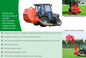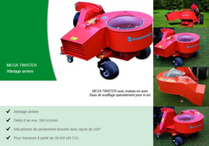De la même façon que son prédécesseur, ce souffleur permet l’élimination efficace des feuilles sur les mêmes surfaces sauf qu’il se fixe à l’arrière d’un tracteur. Il dispose d’un mécanisme de pivotement exclusif continu de 230° lui permettant d’effectuermouvement circulaire de la gauche vers la droite sans devoir faire demi-tour.La buse soufflante est également réglable verticalement à la main.