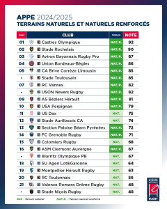 La Ligue Nationale de Rugby (LNR) a dévoilé son classement APPE terrains naturels et terrains renforcés ainsi que le classement APPE Pelouses synthétiques.
