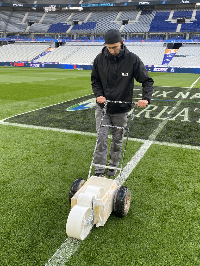 A la mi-temps nous procédons à une remise en état du terrain. Une fois le coup de sifflet final nous nettoyons la surface avec des tondeuses rotatives pour aspirer les déchets liés au jeu puis nous poursuivons la remise en état afin de refermer les divots (les trous). Sur certains matchs comme le France / Pays de Galles du 18 mars, nous devrons démonter les poteaux de rugby, effacer les lignes, changer la configuration complète du terrain afin de pouvoir accueillir l’équipe de France de football 5 jours plus tard.