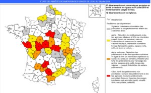 Au 4 juillet 2019, vingt-sept départements sont en « vigilance » (« alerte » en jaune, « alerte renforcée » en orange et « crise » en rouge, comme figuré sur la carte ci-joint). A titre indicatif, des restrictions temporaires pour l’arrosage des terrains de sport sont prévues dès le stade « alerte » et des interdictions totales au stade « crise ». En l’occurrence, parmi ces départements, sept d’entre eux sont classés en alerte « crise »: l’Allier, l’Indre, le Loiret, le Lot, le Tarn, la Vendée et la Vienne.
